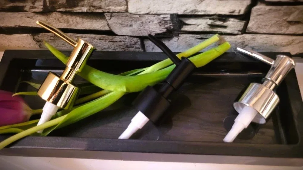 Stelle dir deinen eigenen Seifenspender oder Zahnputzbecher nach deinen Wünschen zusammen. Wähle aus 2 verschiedenen Pumpaussetzern aus.